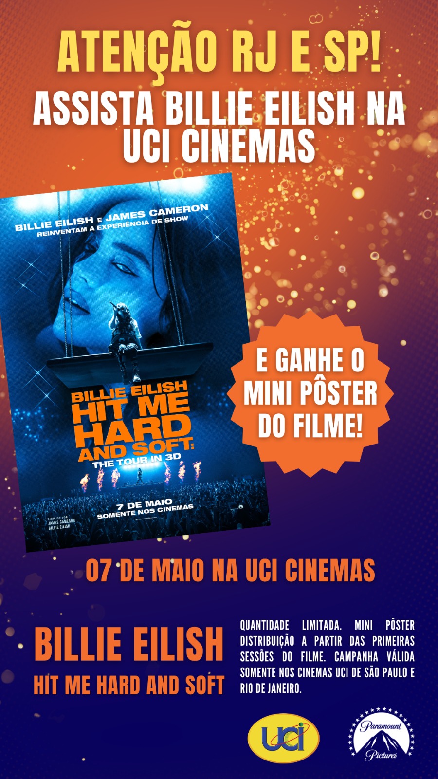 UCI abre nesta quinta-feira, 16, a pré-venda de ingressos para “Billie Eilish – HIT ME HARD AND SOFT: The Tour”, filme-concerto que leva aos cinemas registros da turnê mais recente da artista. O longa será exibido entre 7 e 10 de maio, em sessões especiais da rede, incluindo exibições em 3D e nas salas UCI XPLUS. Os ingressos podem ser adquiridos no site ou nas bilheterias.
